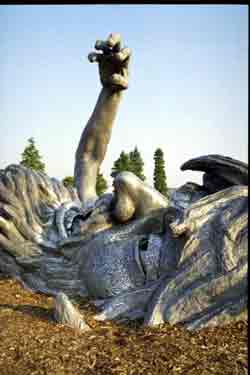 Anyway, I have photos. I was looking for history. I was going to provide stats (like statues per square inch in the District, monuments per capita, etc ... we've got a lot of statues and monuments). The whole nine yards. Did you know that all the statues of military men point toward the White House? Did you know that people ripped up some of the cherry trees just after Pearl Harbor because they were mad at the Japanese? I've got your DC trivia ... come on, test me on my DC trivia! Anyway ... I started running into trouble. There aren't a lot of things written about this statue. Here's what I do know -- "The Awakening" was sculpted by J. Seward Johnson in 1980 and placed at Hains Point in East Potomoc Park. The image -- a giant bearded man, half-buried in the earth -- is writhing and kicking and scrambling in an attempt to wrench himself free from his prison. The right arm sticks up into the sky. His mouth is wide open in some half-formed primal scream. A set of toes point heavenward. It's the barbaric yawp of DC. In the background, across the river, you've got the sight and sound of jets taking off from National Airport. Very cool. Then I read this little notation (this particular quote is from Fodor's 98 Washington DC) – "There are plans to build a peace garden here, with plantings forming a giant olive branch." Ugghh ... As far as I'm concerned, it's like ripping out the Vietnam Memorial and putting in a Pokeman Exhibit. Like renaming a National Airport after Ronald Reagan (remember his whole deal with the air traffic controllers?) ... well, OK, someone already DID name a National Airport after old Ronnie, but you get the point.