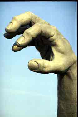 Now it's not that I don't like some of the more famous landmarks in the District. There's nothing quite like sitting on the steps of the Lincoln Memorial first thing in the morning before the crowds have come, or playing softball on the Mall with the Washington Monument as your left field foul pole, or wandering the FDR Memorial in April during the height of the Cherry Blossoms at dusk. I love my monuments. But "The Awakening" speaks to me as the others don't. It's the lightning rod of intern dissent, disgruntled Capital Hill employees, and overworked graduate students. It's man's Id battling against his Superego. It's DC. Sometimes, in my mind's eye, I can almost see the Giant breaking free, grabbing a local yellow line metro train, and popping commuters into his mouth like candy. Then lumbering up to the White House and going to town on Bill and the White House. But I know the Giant will always be raging and roiling in his dirt prison. Unless, of course, they rip him up and put in a peace garden. Unless they take the Giant away. But you know what? It's time to fight. I'm going to take this to the people. I'm going to form a committee and do this the Washington way. I'm going to lead a march. I'm going to have a Giant sit-in. Only we're not going to sing "Kumbaya." Something by the The Pogues or Tom Waits is more appropriate. Maybe Midnight Oil can come by, or Henry Rollins. Some band that yells as much as it sings. Hey, other people have their issues with other monuments. When the Washington Monument was going through its repair stage (with scaffolding surrounding the entire structure), there was much collective hand-wringing over the form it would take. It turned out the scaffolding was cooler looking than the monument, and now people want it back. The FDR Memorial had its own battle when it went up in 1997. The WWII monument is going through the same thing. People don't like the site; they don't like the design. Whatever. The Giant is the important issue. The Giant represents the soul of the city. Peace garden? DC? Give me a break. Keep the Giant alive. Fight for the Giant. It's time to sound OUR barbaric yawp.