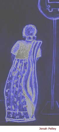 stop on the opposite side of the street, the ends of her sari dampened